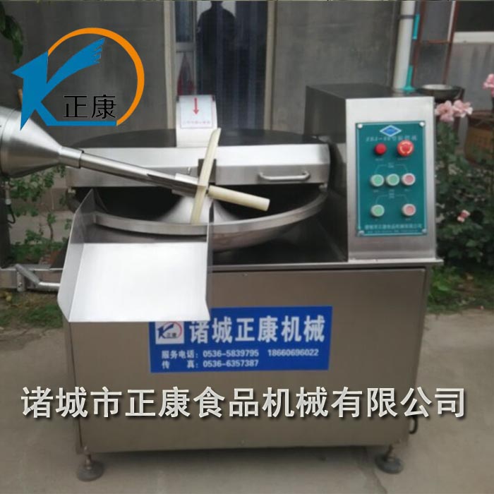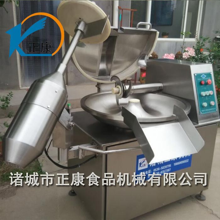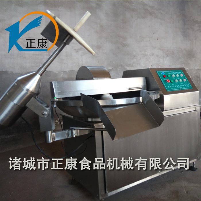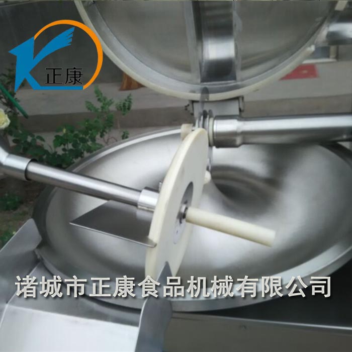 斩拌机是肉类加工中淬取盐溶性蛋白的重要设备,它的作用就是快速地提取蛋白并将蛋白和原料中的水在2~8℃时凝结成胶,形成粘稠的乳化物。该原理是通过装在高速转轴上的6把刀,在可变速的圆盘锅内对肉料进行高速斩切。它对盐溶性蛋白的提取能力是其它设备无法企及的,好的斩拌机对盐溶性蛋白的提取能力可达68%。