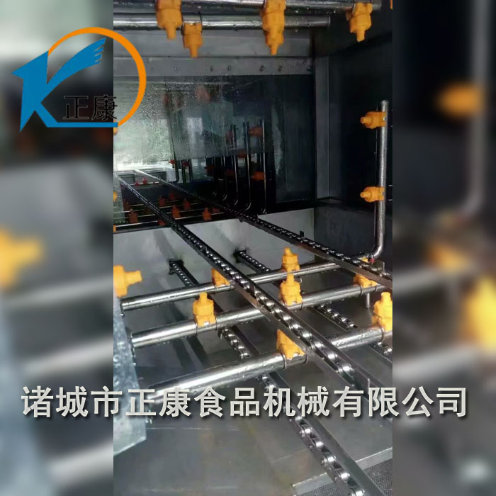 设备原理需清洗的周转筐由不锈钢链条输入清洗机中,依次通过加温老碱水→高压热水→常温自来水→消毒水→常温风刀去水等多道工序,将筐子清洗干净,同时完成杀菌及风干;特殊筐子清洗时可在热碱水清洗段后加配毛刷,对筐子底部及左右两侧进行刷洗,提高清洗效果;采用连续式清洗,以提高清洗效率;